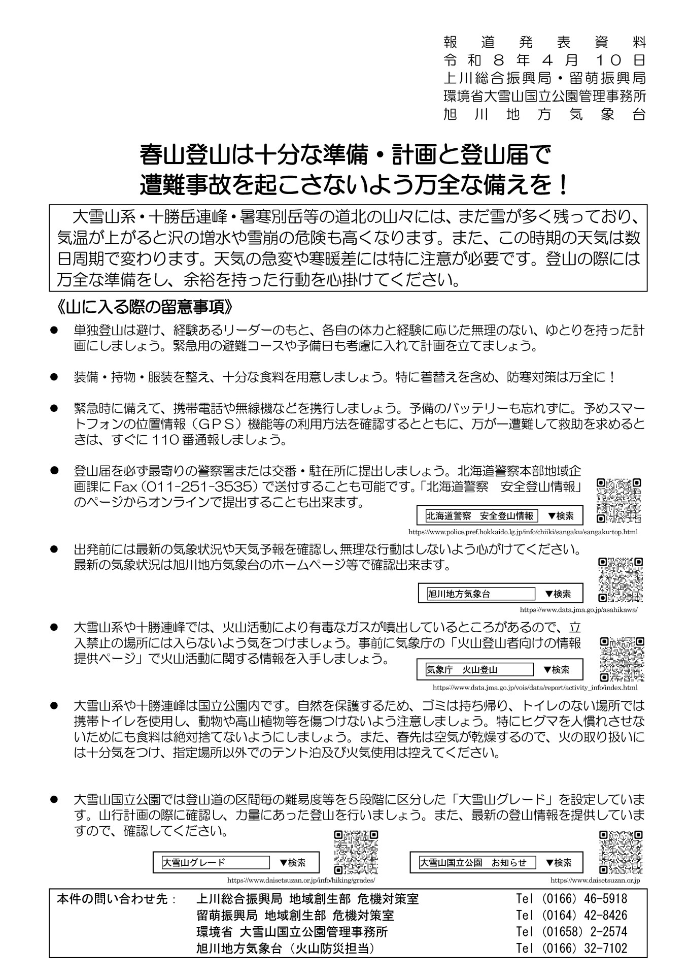 上川総合振興局・留萌振興局 環境省大雪山国立公園管理事務所 旭川地方気象台より、