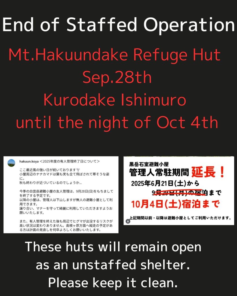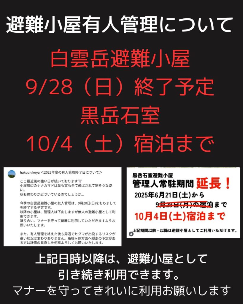 【避難小屋有人管理終了について】End of Staffed Operation