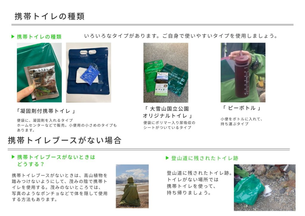 In Daisetsuzan National Park, there are disposal bins for portable toilets at Sounkyo Onsen, Aizankei Onsen, Daisetsukogen Onsen, Asahidake Onsen, Juuroku-no -sawa trailhead, Horoka Onsen trailhead, Tomuraushi trailhead, Shirogane Onsen, Bogakudai Observatory, Fukiage Onsen and Tokachidake Onsen. Note that not all trailheads have disposal bins, so if there are no disposal bins at your trailhead, please take the portable toilet home for disposal.